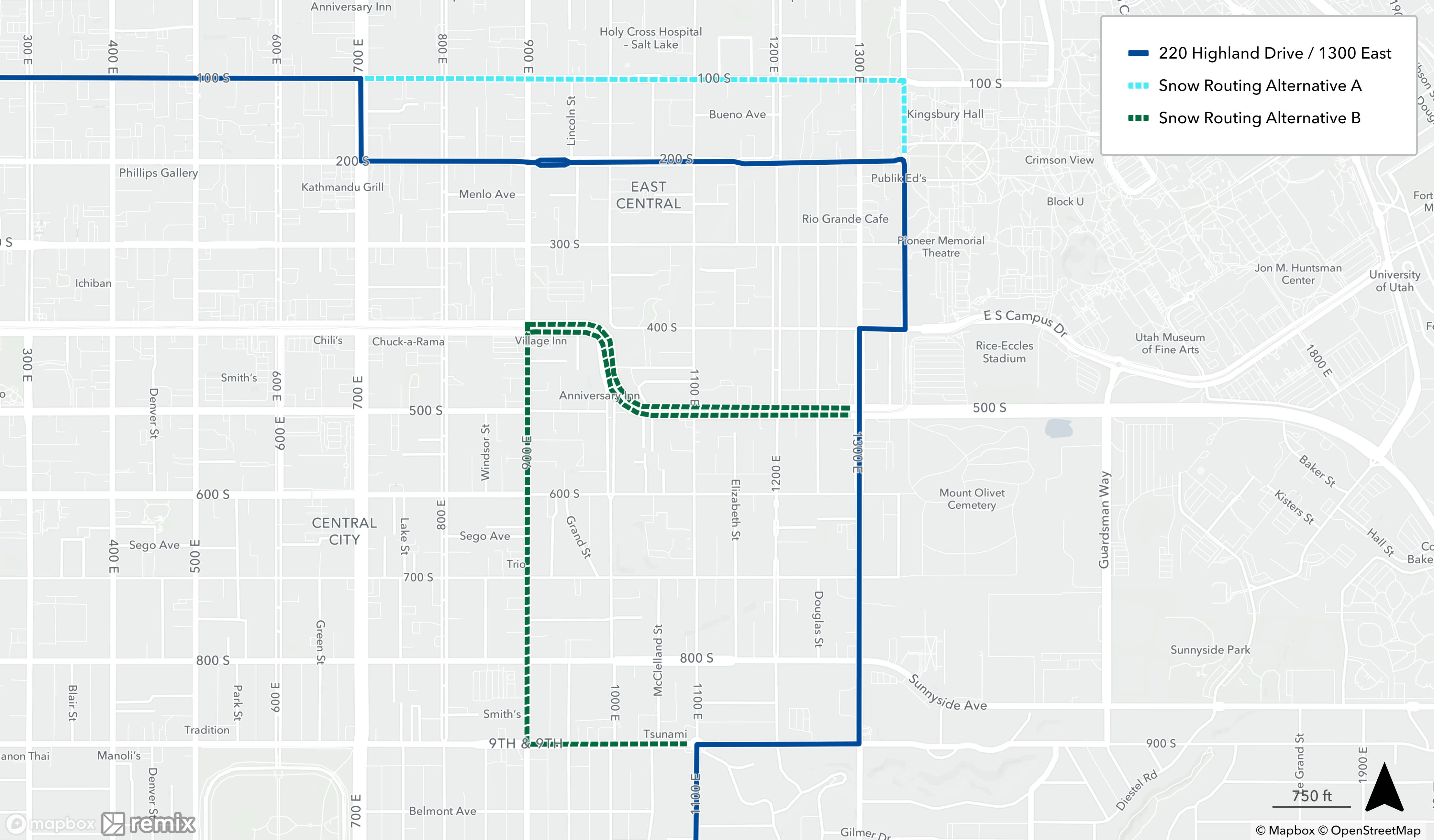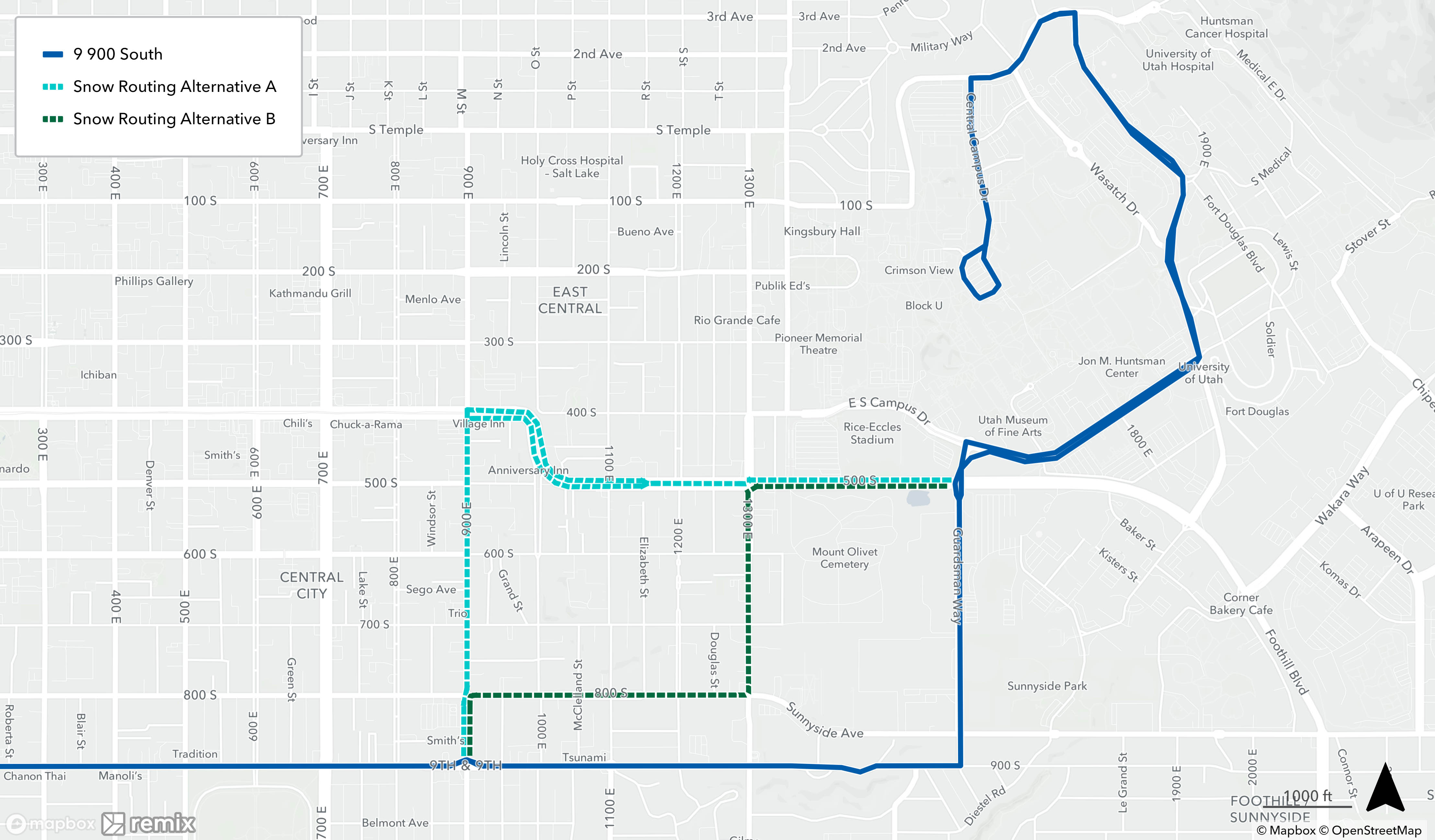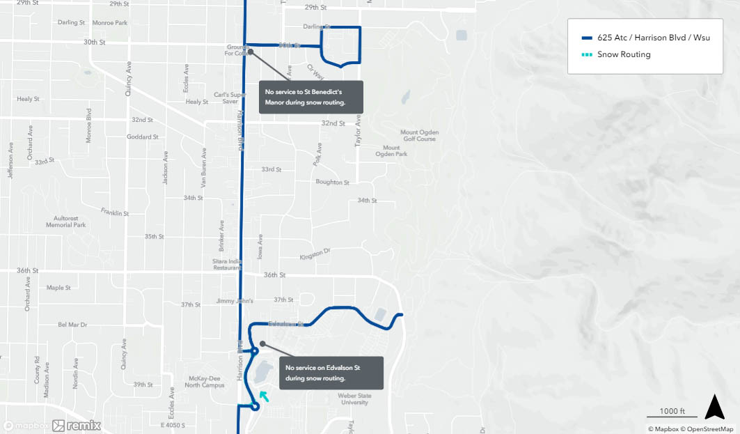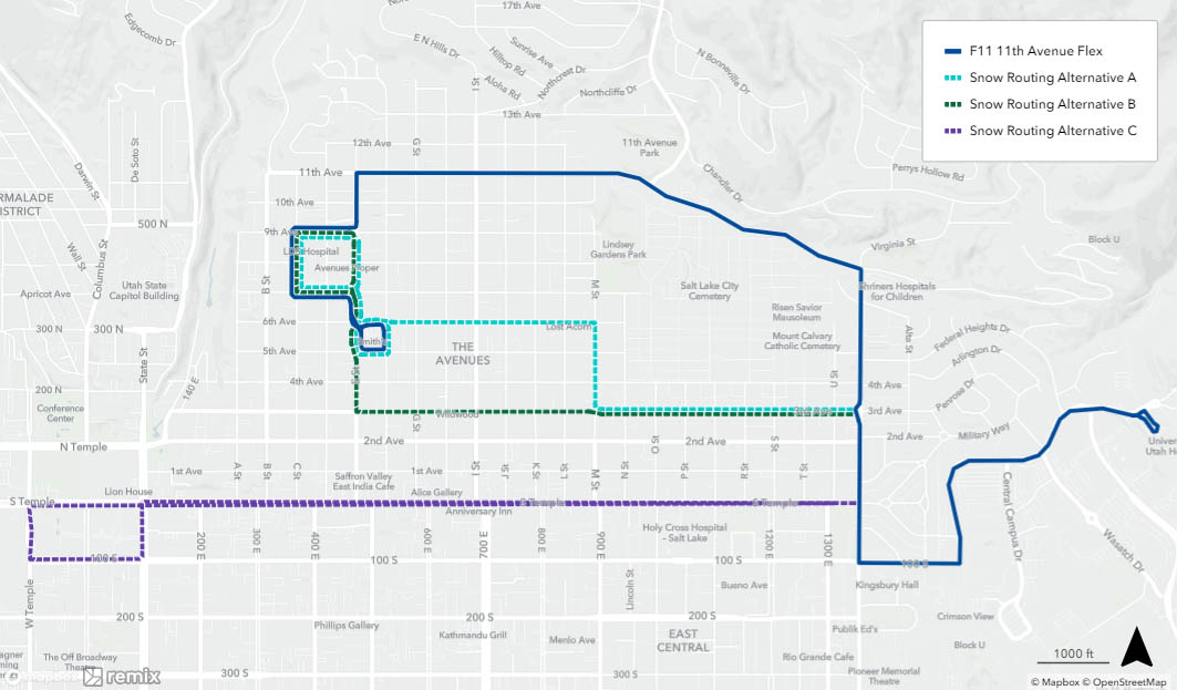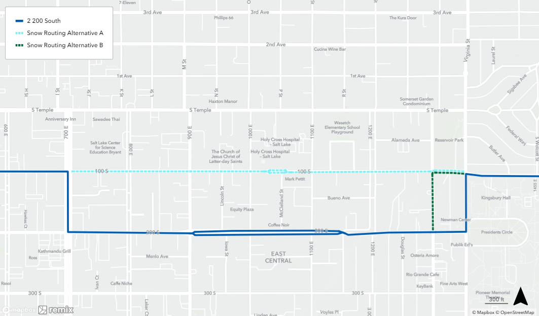 When a bus is on snow routing, it will detour from its regular route. You may need to catch your bus at a different location during this time. See below to find your route’s specific snow routing map to determine where to catch the bus. If you need assistance, please call 801-743-3882 or contact us on Twitter at @RideUTA or sign up to receive route-specific notifications.