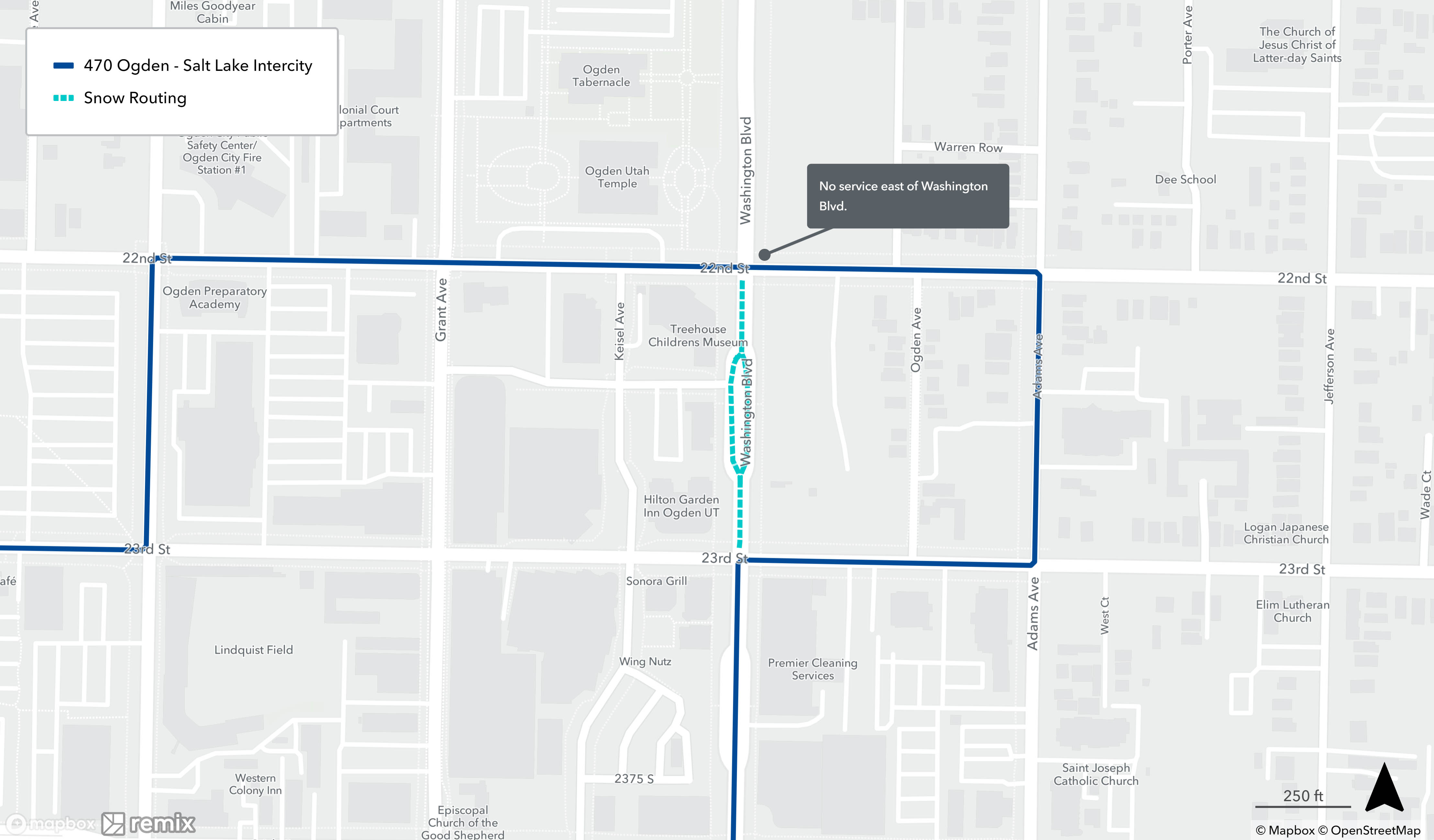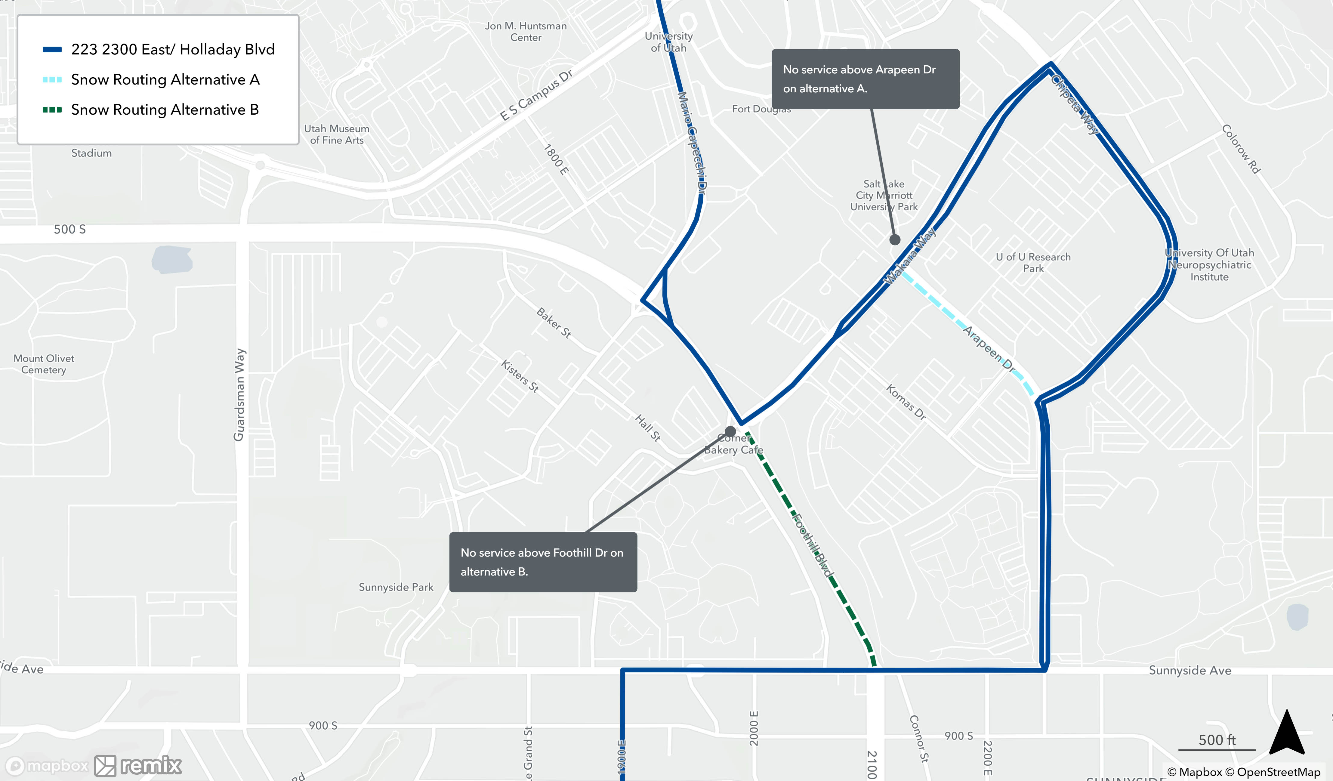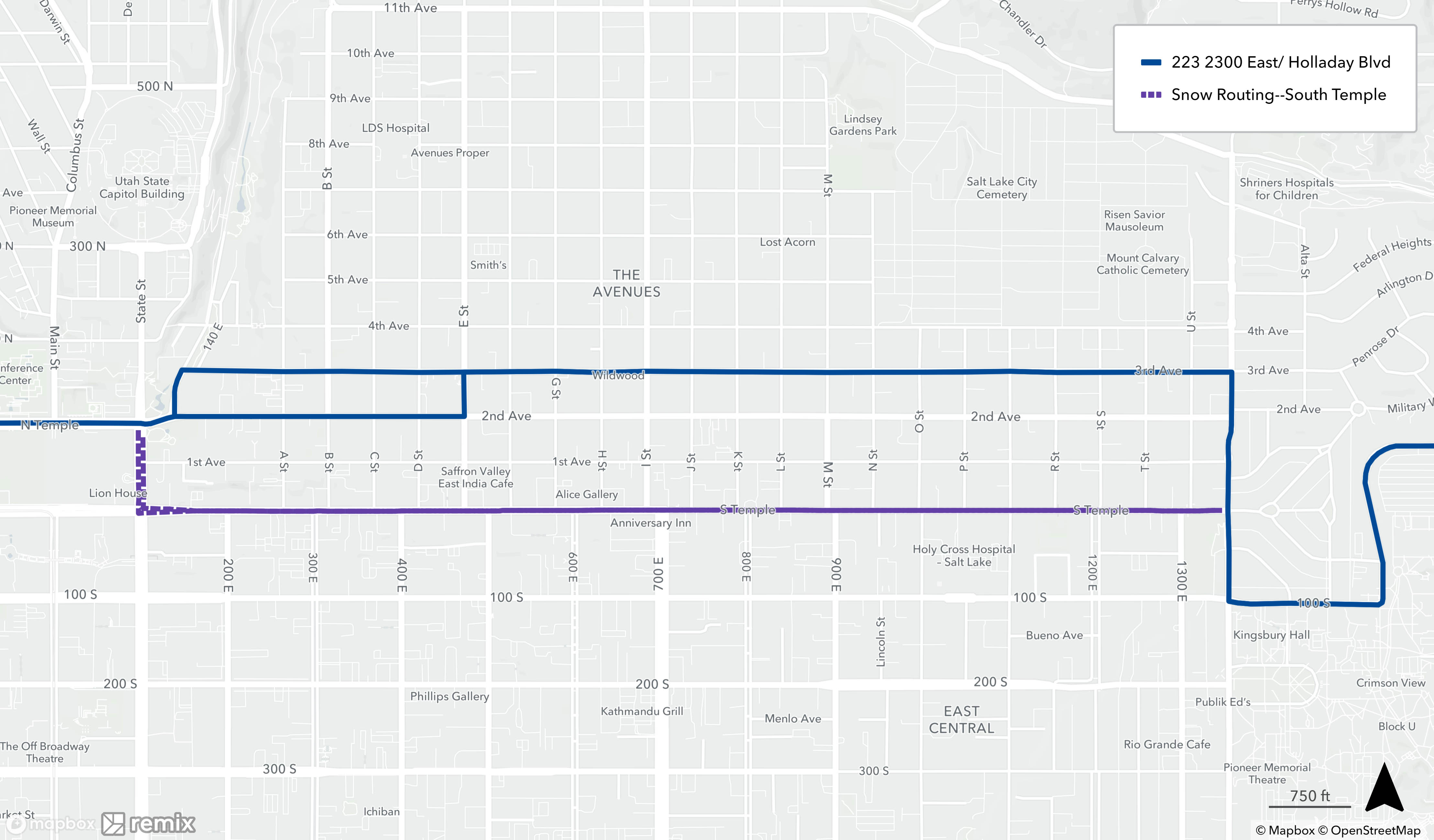 When a bus is on snow routing, it will detour from its regular route. You may need to catch your bus at a different location during this time. See below to find your route’s specific snow routing map to determine where to catch the bus. If you need assistance, please call 801-743-3882 or contact us on Twitter at @RideUTA or sign up to receive route-specific notifications.